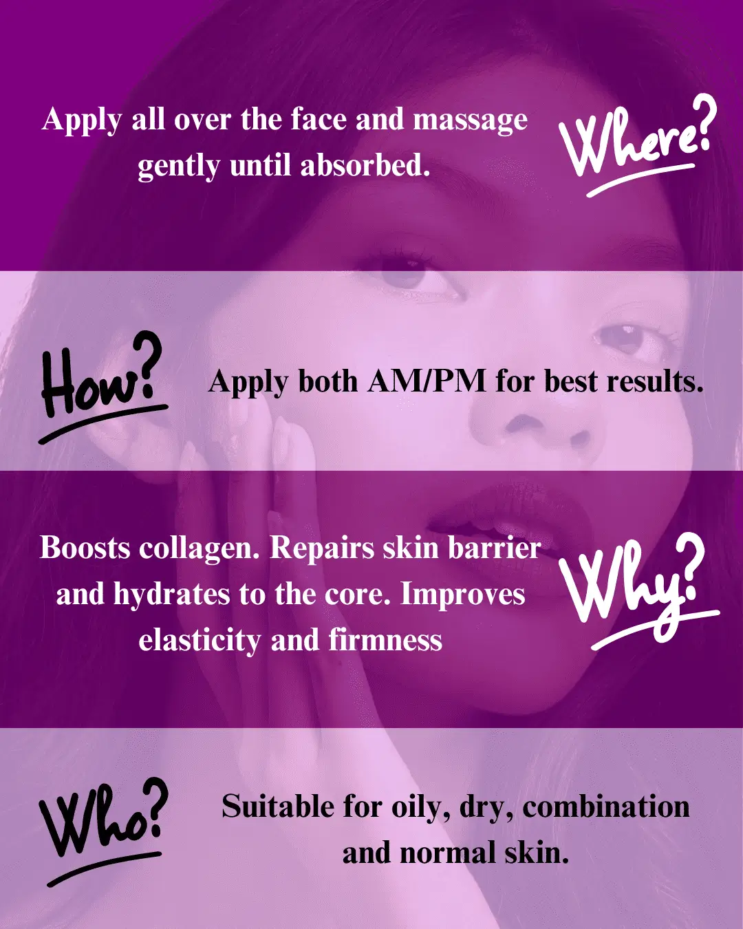 For Collagen boosting, Collagen stimulation, Skin elasticity and firmness, dryness, barrier repair, pigmentation, fine lines and wrinkles.
