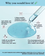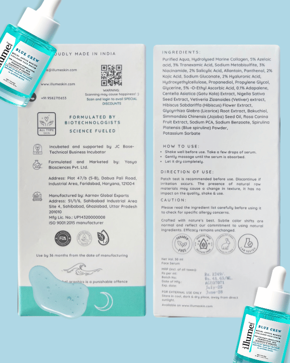 Purified Aqua, Hydrolysed Marine Collagen, 5% Azelaic acid, 3% Tranexamic Acid, Sodium Metabisulfite, 3% Niacinamide, 2% Salicylic Acid, Allantoin, Panthenol, 2% Kojic Acid, Sodium Gluconate, 2% Hyaluronic Acid, Hydroxyethylcellulose, Propanediol, Propylene Glycol, Glycerine, 5% -O-Ethyl Ascorbic Acid, 0.1% Adapalene, Centella Asiatica (Gotu Kola) Extract, Nigella Sativa Seed Extract, Vetiveria Zizanoides (Vetiver) extract, Hibiscus Sabdariffa (Hibiscus) Flower Extract, Glycyrrhiza Glabra (Licorice) Root Extract, Bakuchiol, Simmondsia Chinensis (Jojoba) Seed Oil, Rosa Canina Fruit Extract, Sodium PCA, Sodium Benzoate, Spirulina Platensis (Blue spirulina) Powder, Potassium Sorbate